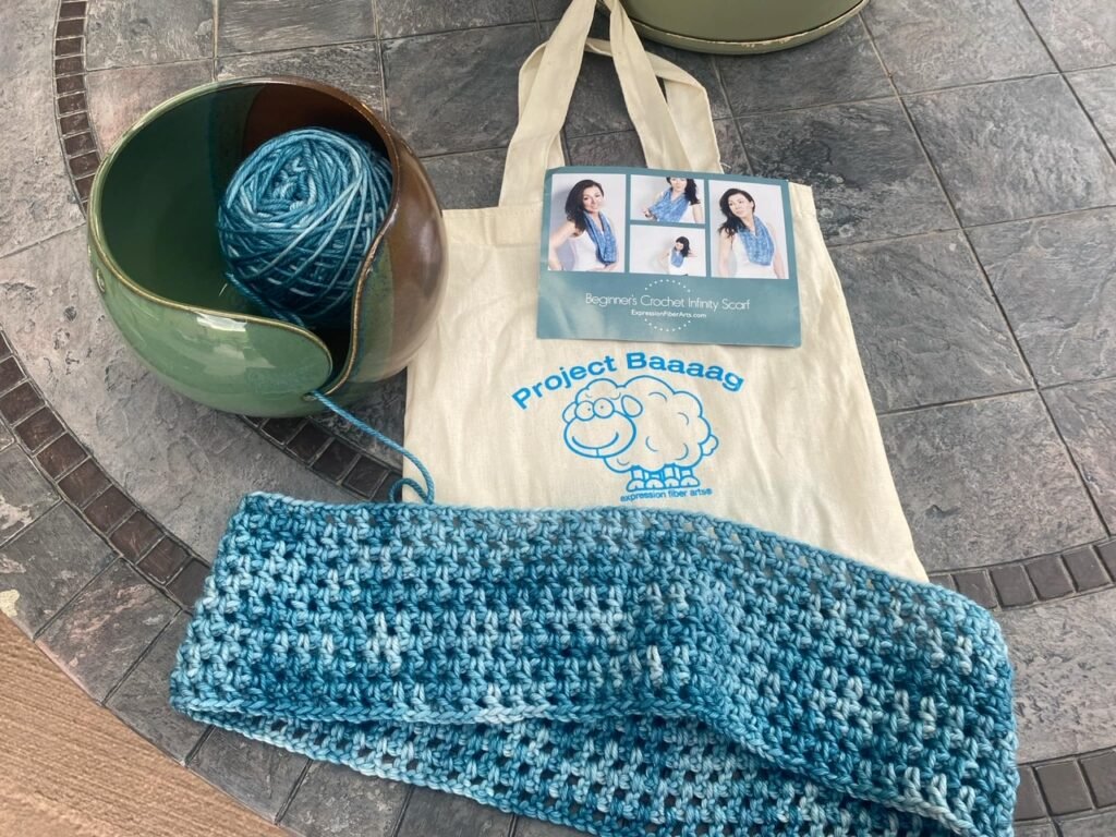 I have been working on the Infinity Scarf I wrote about last week. This yarn from Expression Fiber Arts is so beautiful, and it’s wonderful to work with! Here’s an in-progress picture. Looking forward to feeling better so I can work on it more and get it completed.